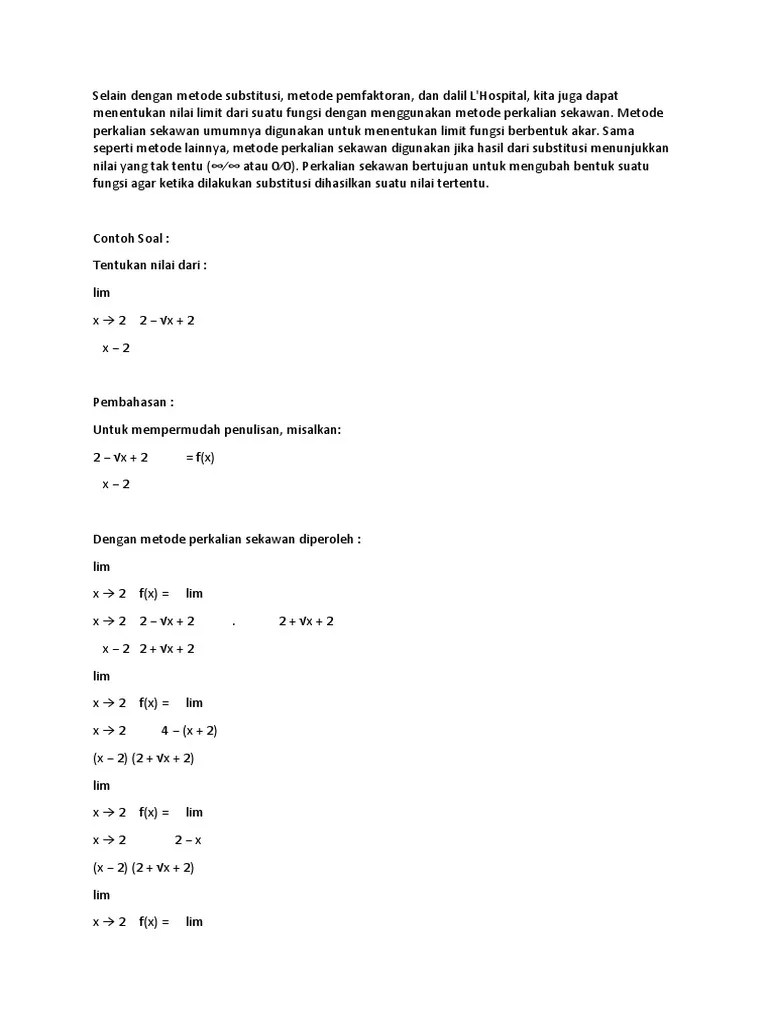 Limit aljabar bentuk tak tentu akar pangkat . Contoh soal dan pembahasan limit perkalian sekawan. Contoh soal limit akar pdf. Kita dapat mengubah cos 2 x 1 menjadi sin 2 x. Contoh soal menyelesaikan limit dengan mengalikan sekawan (1).
